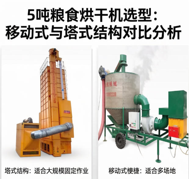對于產量在5噸上下的糧食烘干場景,選擇合適的設備類型重要。當前市面上主流選擇集中在移動式烘干機與塔式烘干機兩種結構。本文將從多個角度對比分析,為用戶選型提供參考。